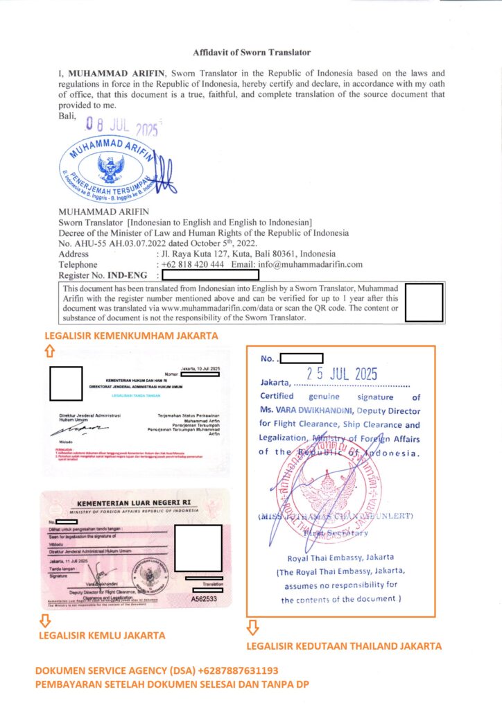Bagi anda yang ingin melegalisir ijazah di Kedutaan Thailand untuk keperluan bekerja, pengurusan visa, izin tinggal dan lain-lain dan tidak memiliki banyak waktu untuk pengurusan tersebut kami akan membantu anda. Document Service Agency (DSA) adalah profesional jasa terjemah, legalisir, atestasi, apostile dokumen dan pengurusan visa terpercaya dan berpengalaman. Dengan layanan “Pembayaran Setelah Dokumen Selesai dan Tanpa DP” membuat anda nyaman dan aman menggunakan jasa kami.